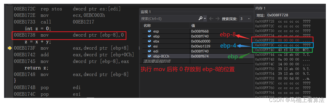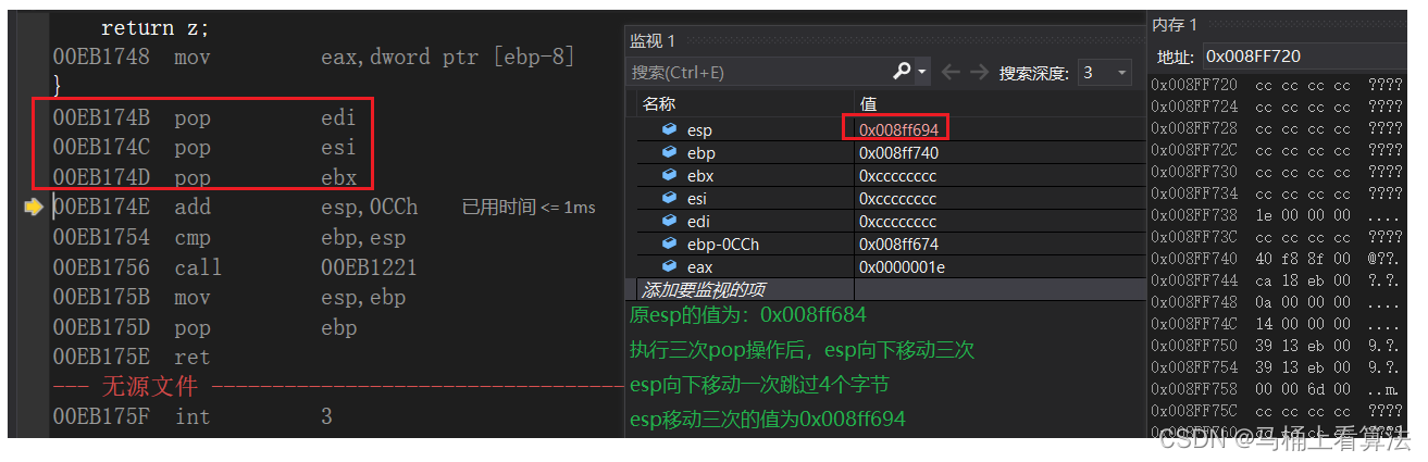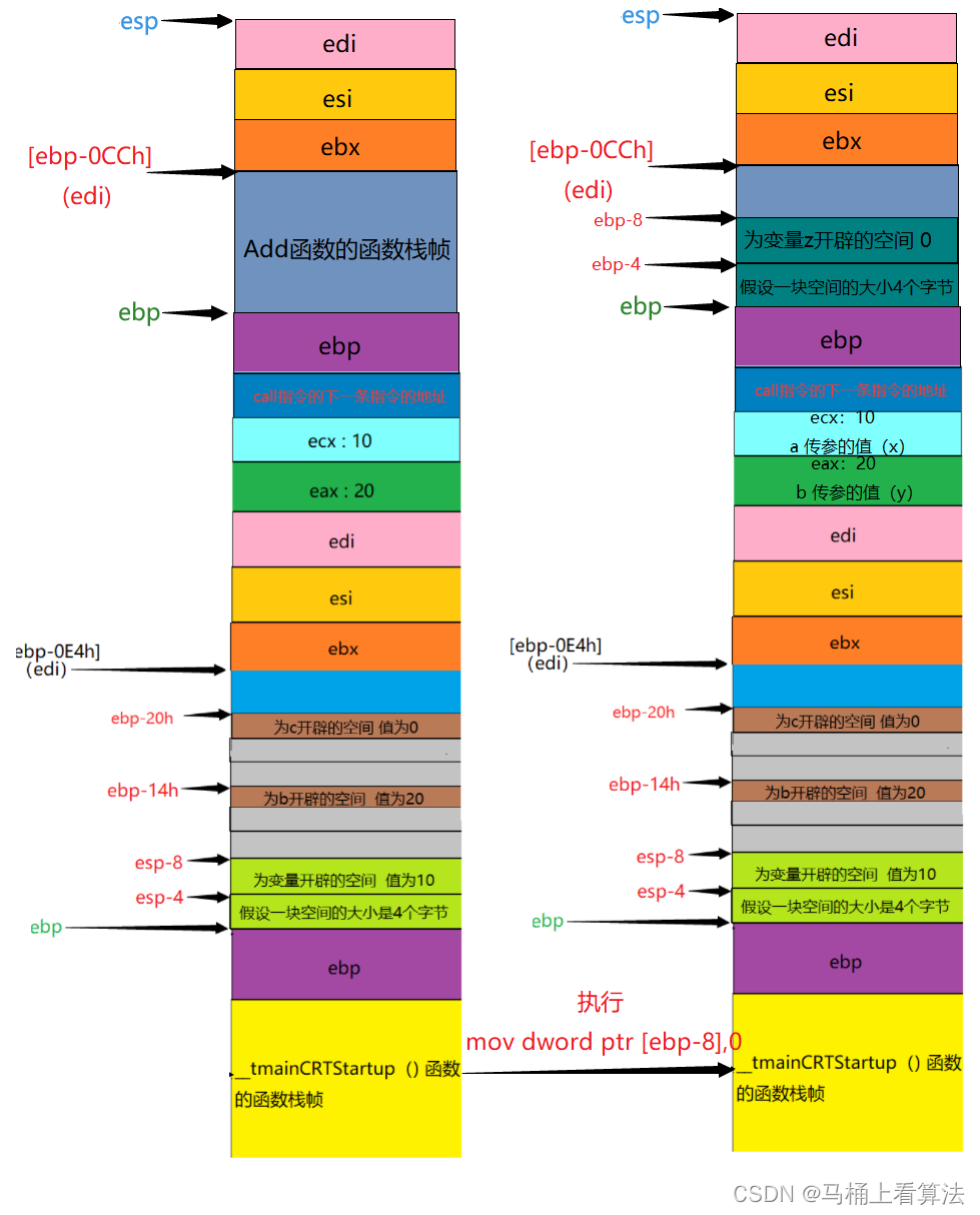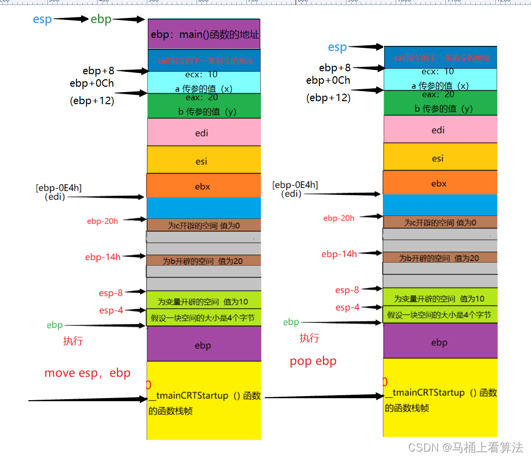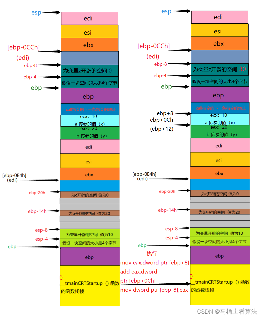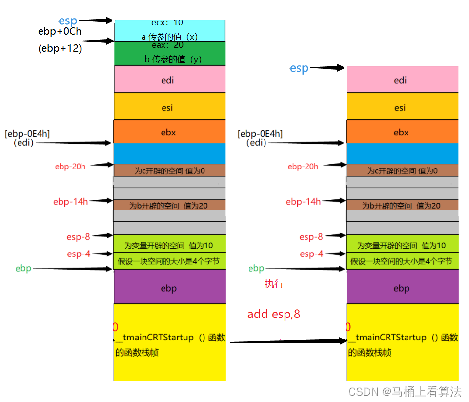 esp+8,esp 向下移动,当esp向下移动指向 esp+8 的地址时,形参 x 、y 的空间被释放。