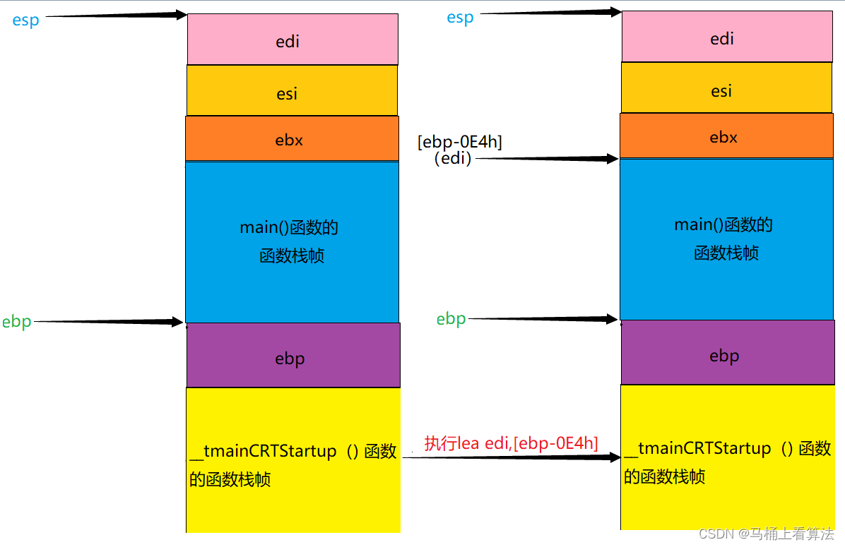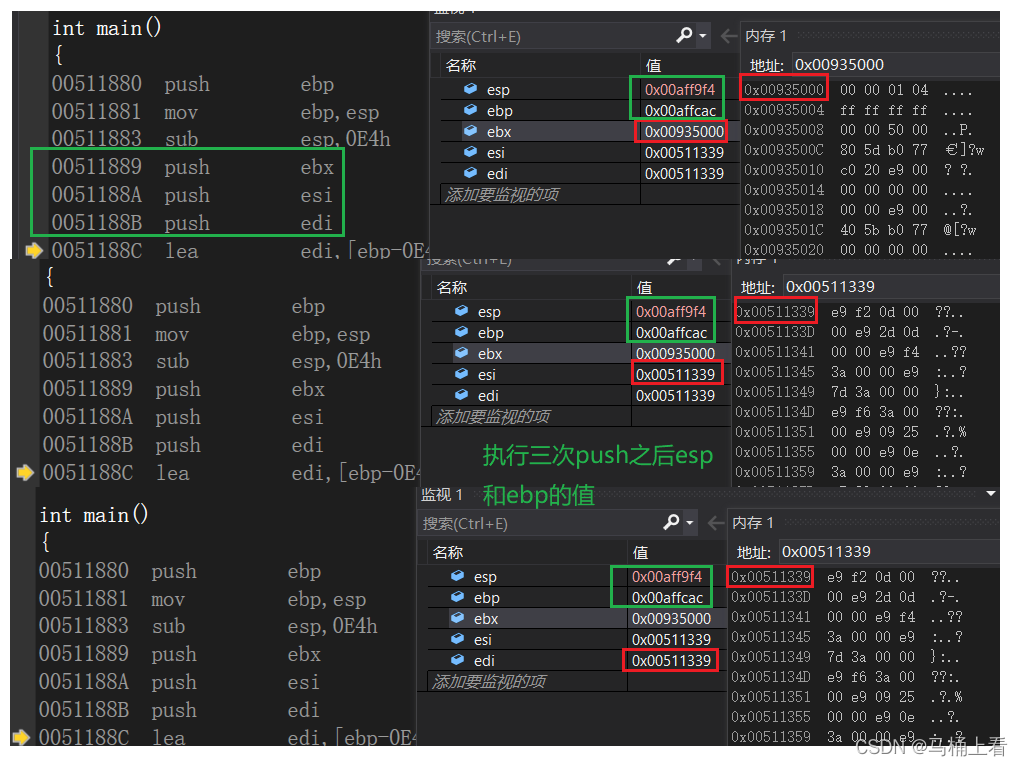 ebp-0E4h的值为三次push前esp指向的值,三次push前esp指向的是main()函数的函数栈帧的栈顶;所以ebp-0E4h的值为main()函数的函数栈帧的栈顶的值,即edi中存放的的值为main()函数的函数栈帧的栈顶的值