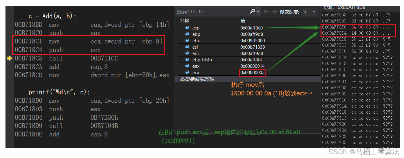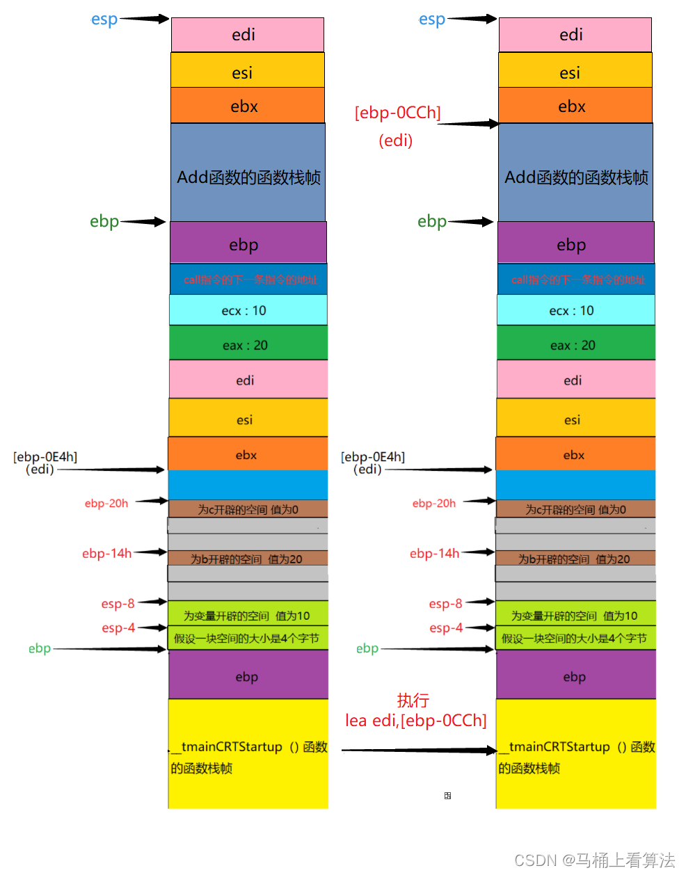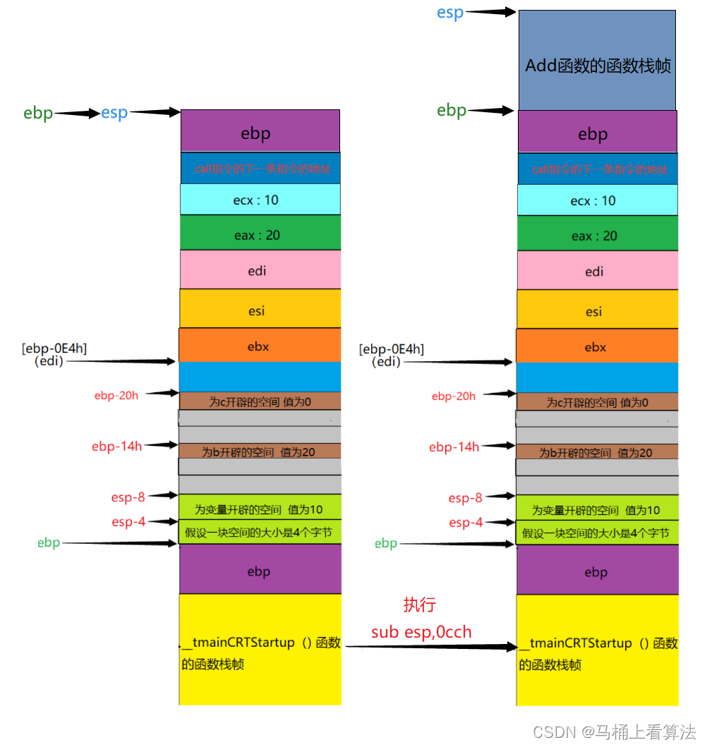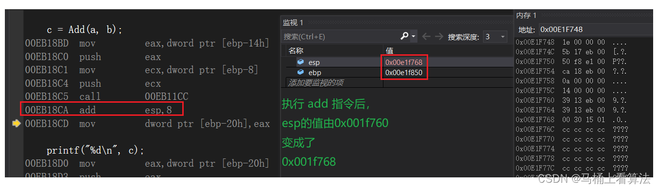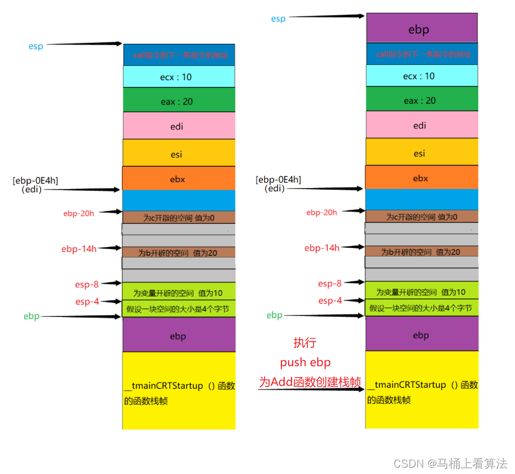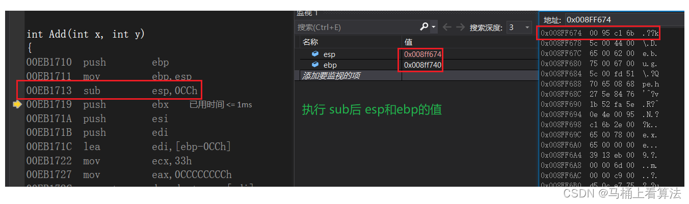 与 main 函数栈帧的创建相同,先为 Add 函数栈帧做准备工作,再执行C语言代码。