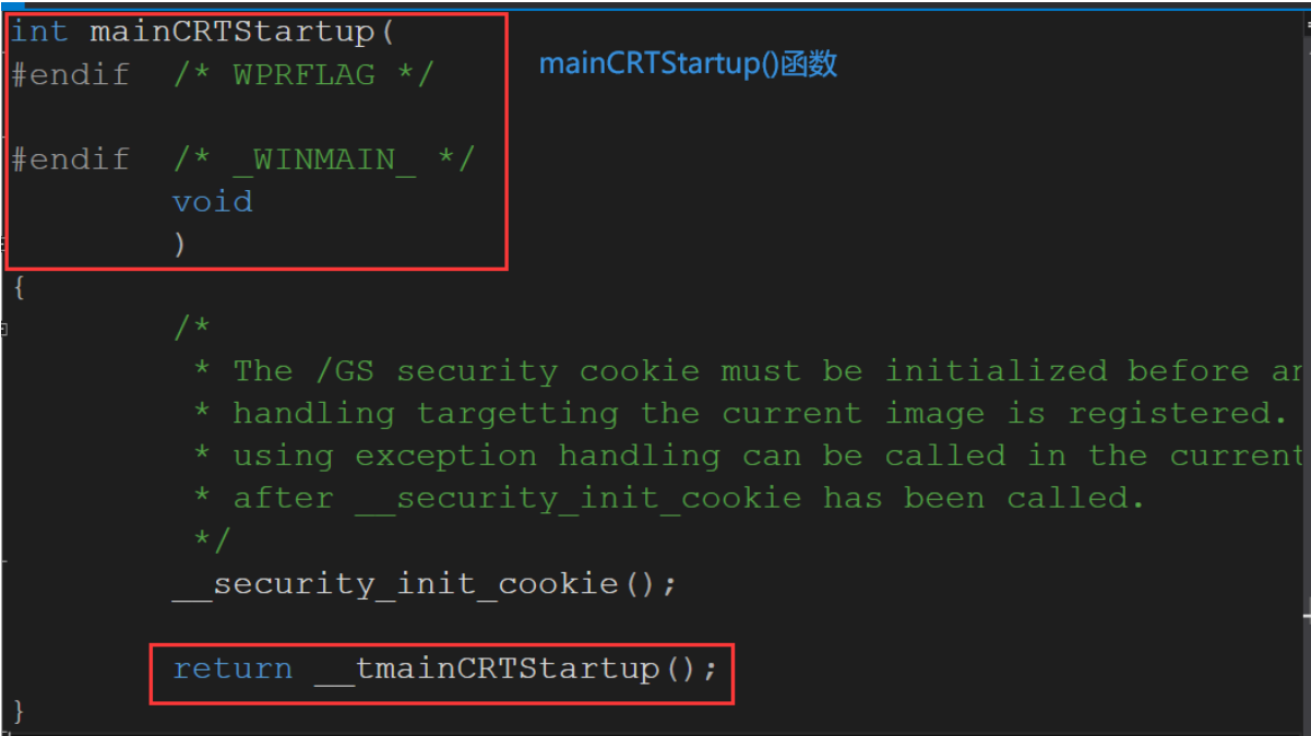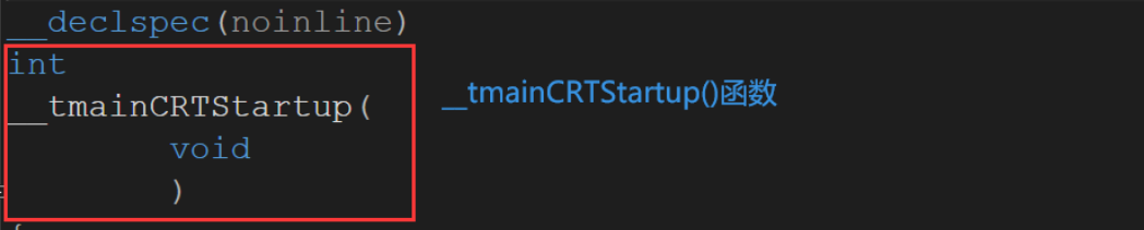 可以看到main() 函数是被 __tmainCRTStartup() 函数调用的;__tmainCRTStartup() 函数是被 mainCRTStartup() 函数调用的。