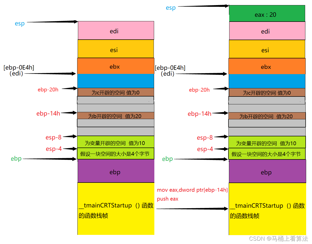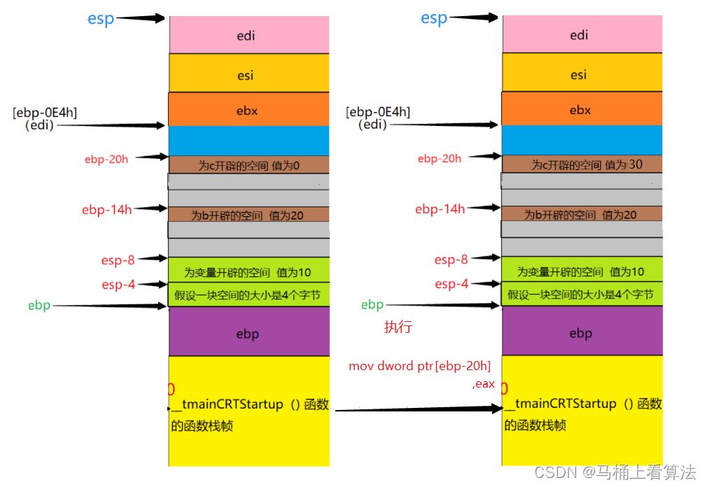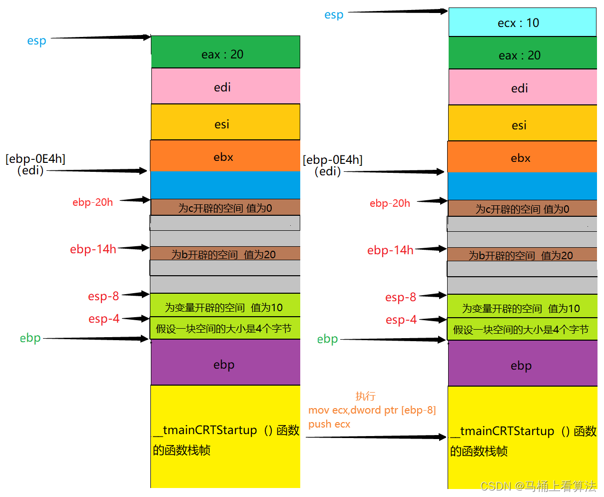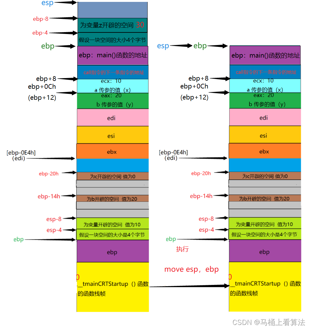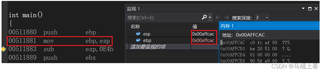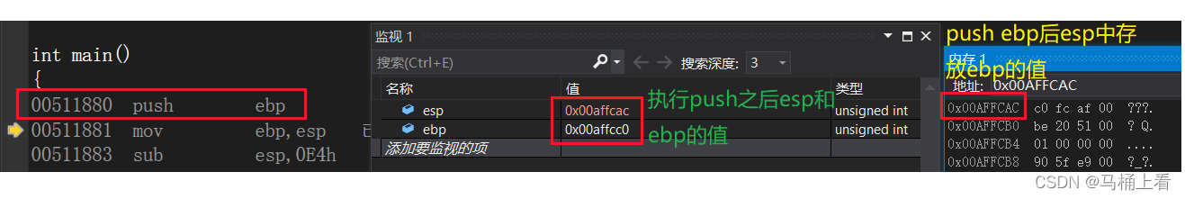 将 ebp 的值放到 esp 指向的地址的上面,esp ( 栈顶指针) 向上移动指向 ebp(此时ebp 中存放的是 main 函数栈帧栈底的地址)。