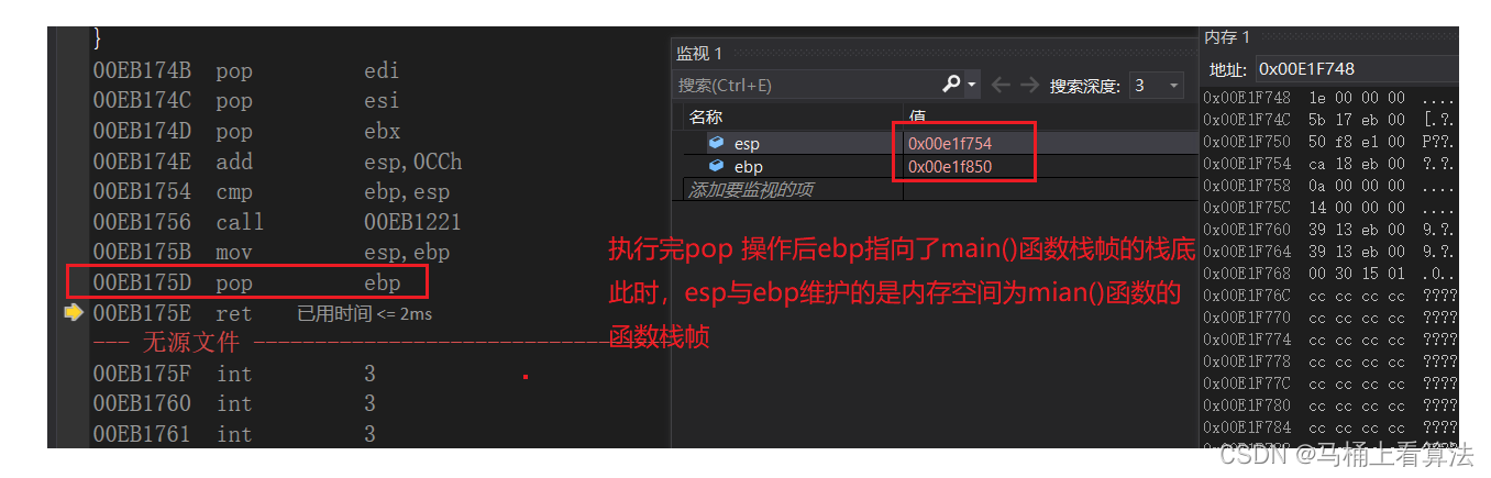 将栈顶 ebp 的值弹出。当前 ebp 存放的是 main 函数栈帧栈底的地址。执行 pop ebp 指令后,ebp 就会指向 main 函数栈帧的栈底。