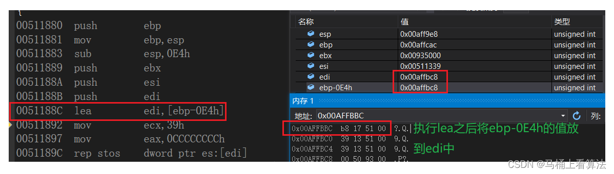 将 [ ebp-0E4h ] 加载到 edi 中(将 [ ebp-0E4h ]这个值放到 edi 里面)。
