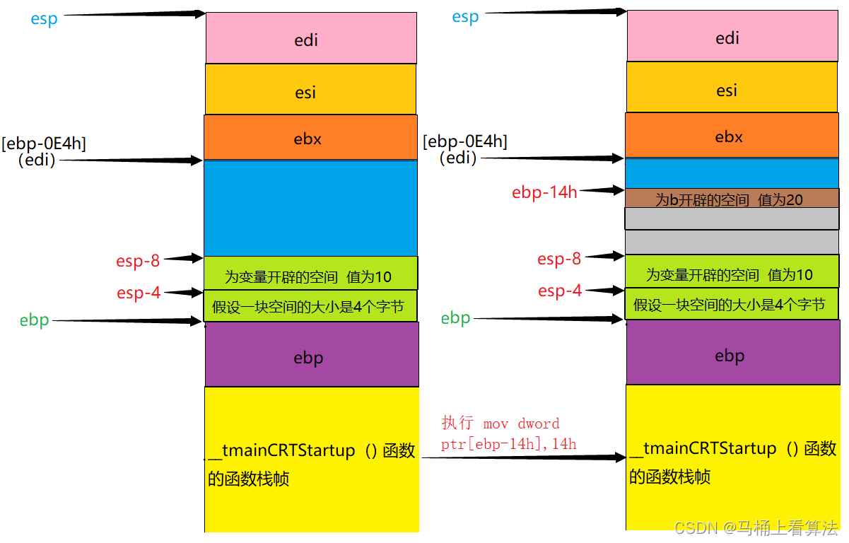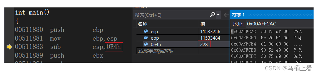 esp - 0E4h (八进制数,转换为十进制值为:228),将esp减去一个228