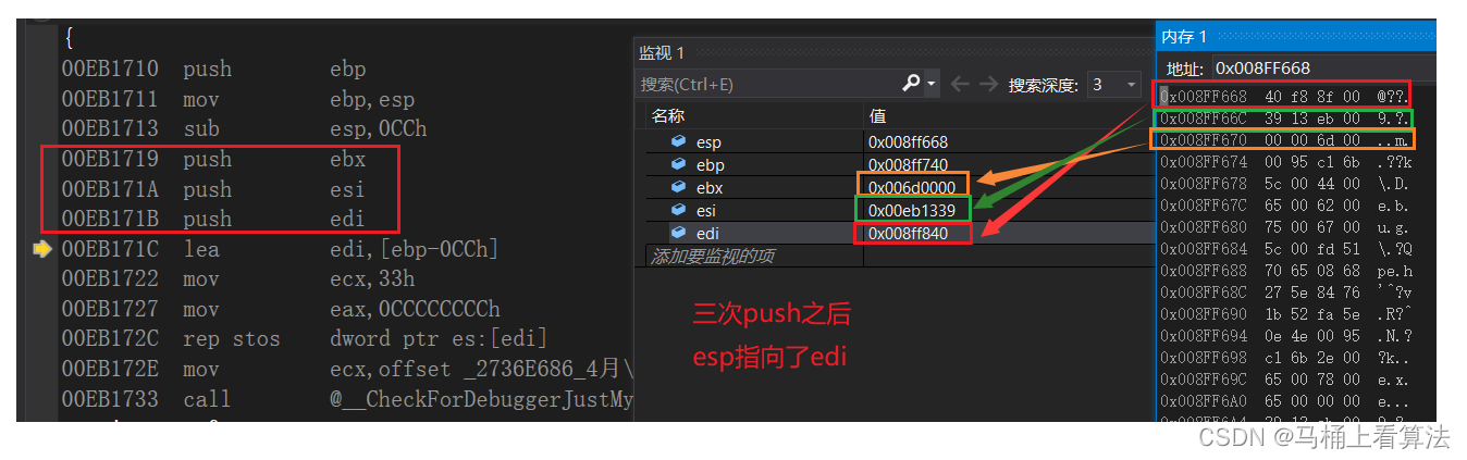 根据图可以看出来,三次push之后确实是把ebx、esi、edi的值压进去了。