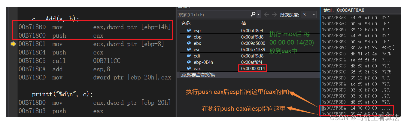 将 ebp-14h 中存放的值放到 eax 中。ebp-14h 是变量 b 所在空间的地址,也就是将 20 放到 eax 中。