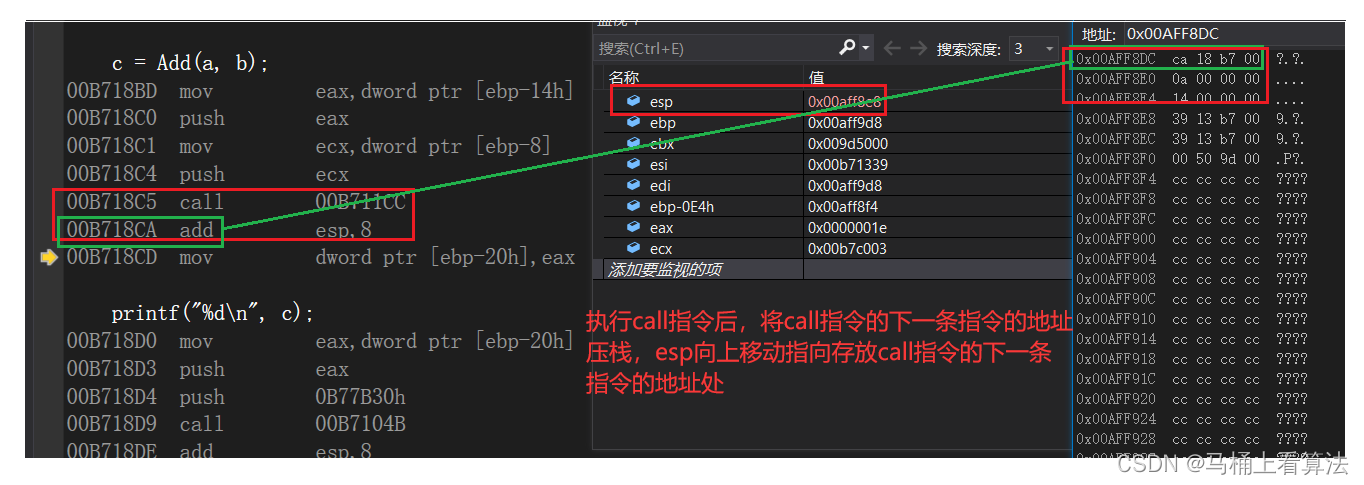 执行 call 指令以后会将 call 指令的下一条指令的地址压栈。这里将地址压栈是为了记住 call 指令的下一条指令的地址,记住这个地址是为了调用完 Add函数后返回到这个地址,再从这个地址继续往下执行。
