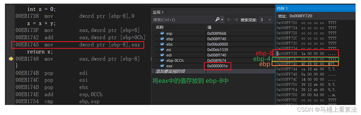 执行 return z; 以后,变量 z 的空间就会被销毁,在销毁之前将里面的值放到 eax(寄存器)中,这样 Add 函数计算后值就可以返回到 main 函数中。