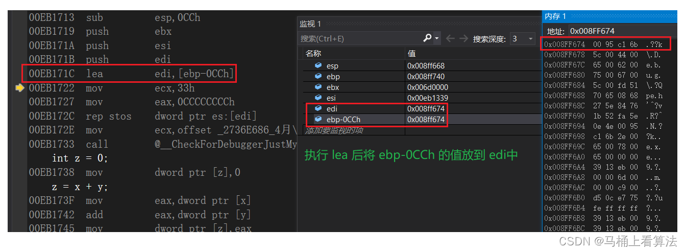 将 [ ebp-0CCh ] 加载到 edi 中(将 [ ebp-0CCh ]这个值放到 edi 里面)。