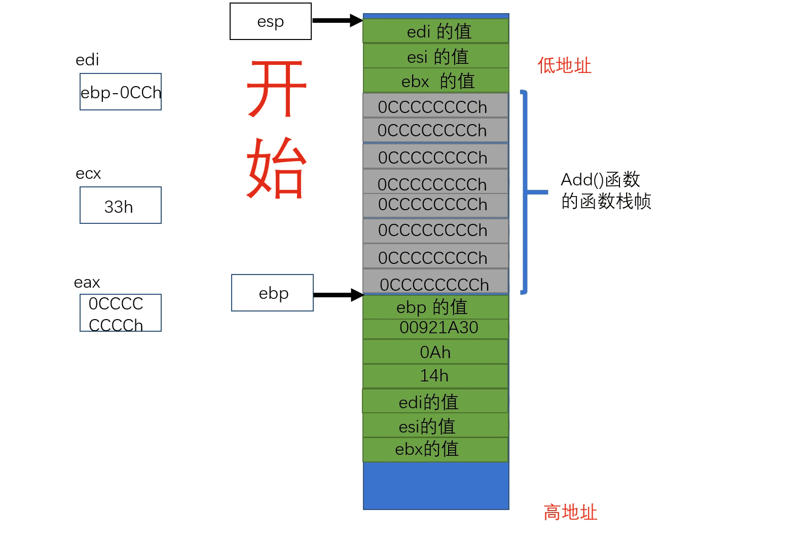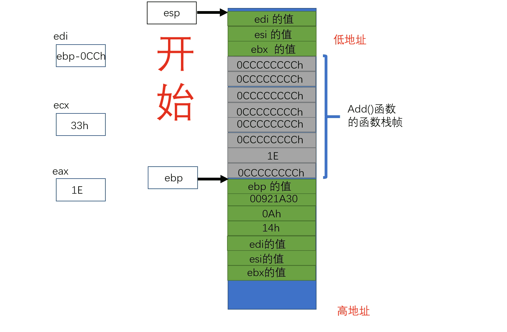 rep stos dword ptr es:[edi]:从edi ( 此时 edi 中存放的是Add函数栈帧栈顶处的值 ) 开始向下将空间中的值初始化为0CCCCCCCCh(eax)(每次操作4个字节),总共初始化 33h(ecx) 次。