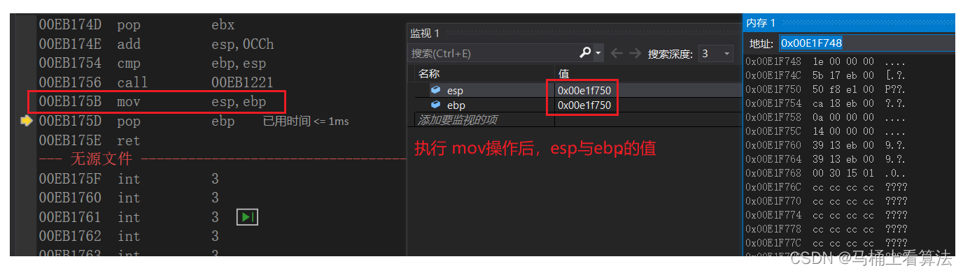 将 esp 的值赋给 ebp,ebp 就会向上移动指向 esp 所指的位置