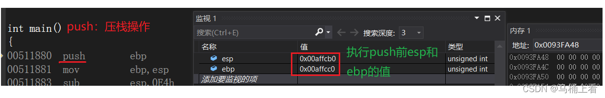注意:每一次执行push操作之后,esp都会向上移动(低地址)