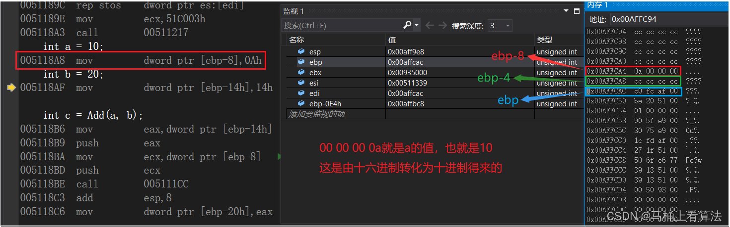 将 0Ah(0Ah 转化为十进制就是 10)放到 ebp - 8 这个位置。