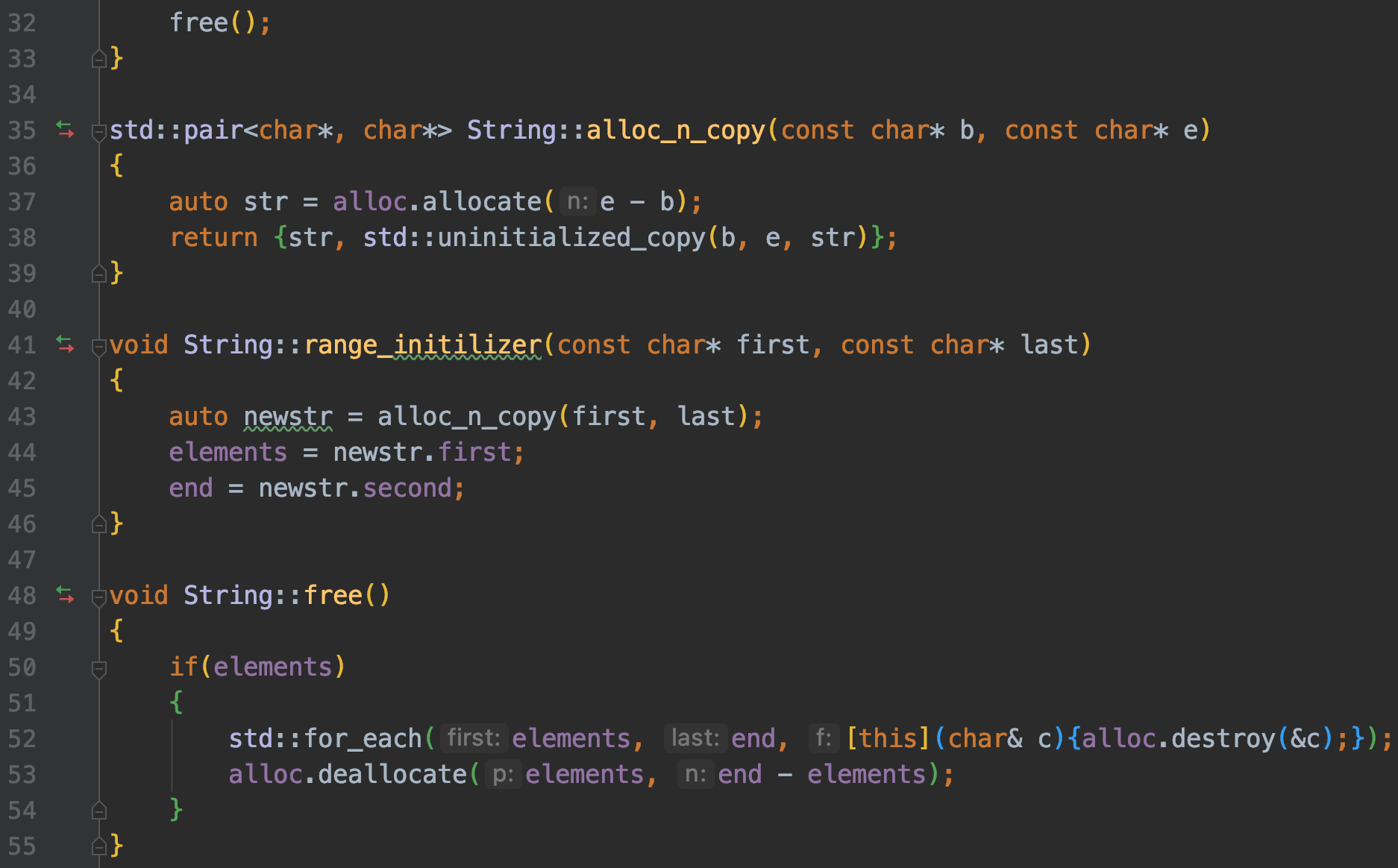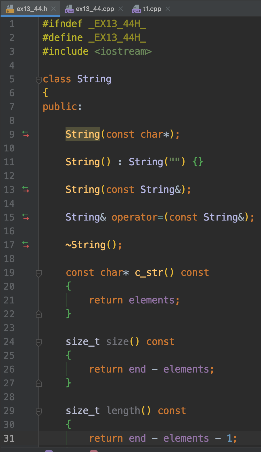 13.44 编写标准库 string 类的简化版本,命名为 String。你的类应该至少有一个默认构造函数和一个接受 C 风格字符串指针参数的构造函数。使用 allocator 为你的 String类分配所需内存。
