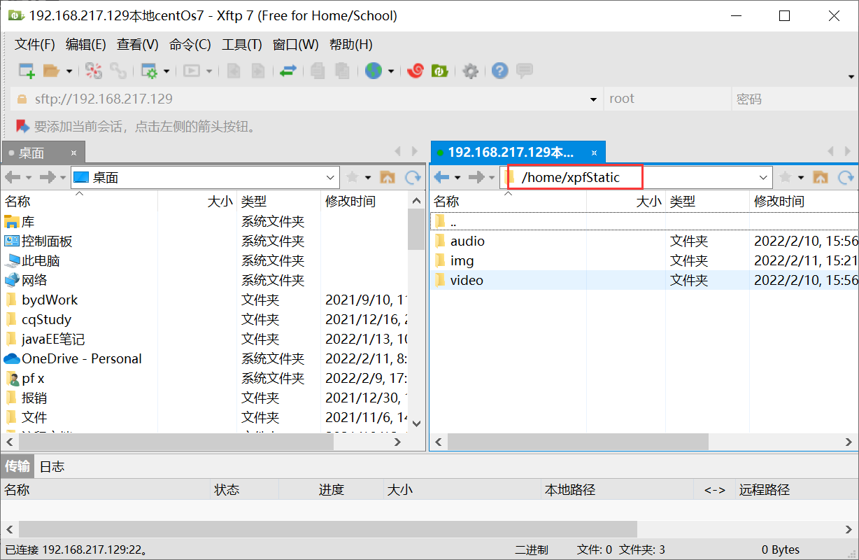 先把xpfStatic和foodie-shop静态资源上传到服务器的/home文件夹。其中xpfStatic中有三个文件夹如下。