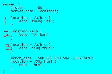 当我们以http://172.17.0.2/a/b/c访问时,虽然1,2,3都会被命中,但是执行location3,屏幕输出“jing zhun”