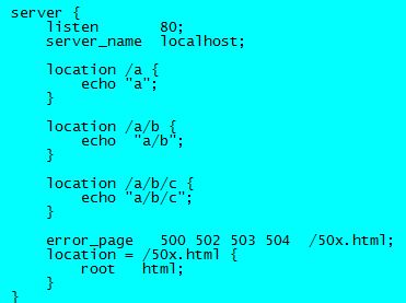 同样是三个location,当我们以http://172.17.0.2/a/b/c去访问时,虽然1,2,3都会被命中,但是执行location3(最长匹配),屏幕输出“a/b/c”