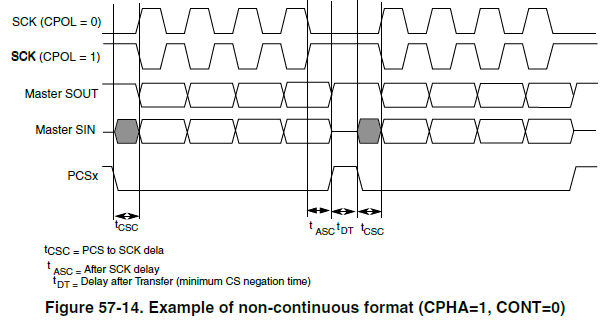 连续SCK 模式下必须使CPHA = 1。如果CONT_SCKE位置1,CPHA位清零无效。修改传输格式支持连续SCK。
