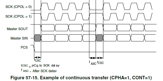 启用Continuous SCK会禁用PCS到SCK延迟,并且传输后延迟(tDT)固定为一个SCK周期。
