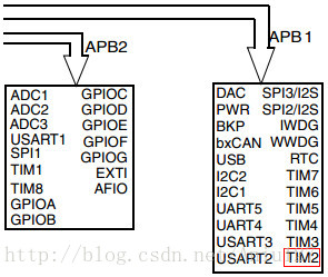 注意:APB1和APB2上挂的外设如图所示: