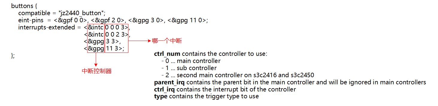 a. 在设备节点中描述(表明使用"哪一个中断控制器里的哪一个中断, 及中断触发方式"),比如: