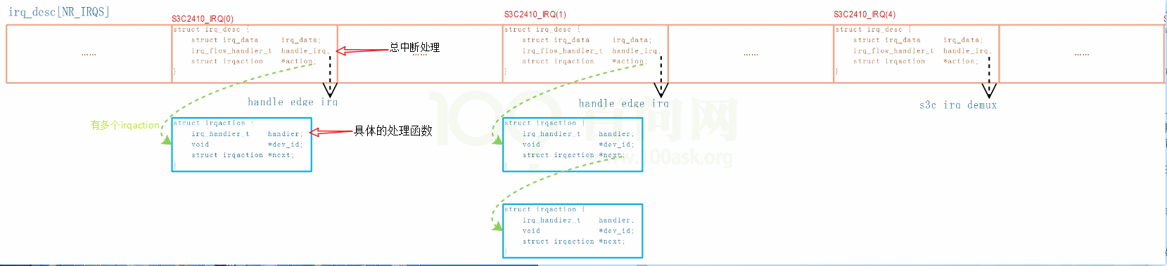 最简单方法是创建指针数组,每一项对应一个中断,在这个中断里存放处理函数,这个数组用irq_desc中断结构体来表示