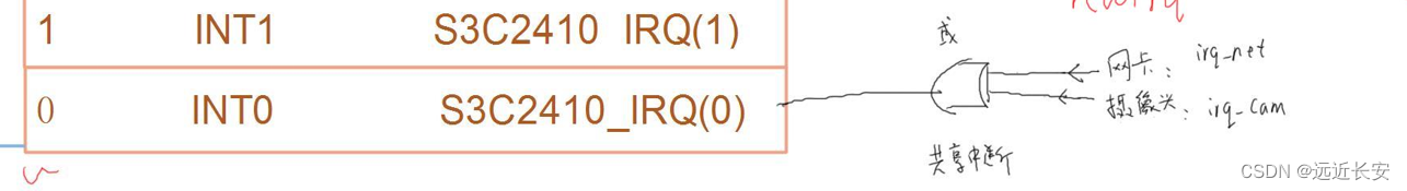 假设0号中断外接了网卡和摄像头,它们是一个或的关系,也就是不论是网卡还是摄像头发生了中断,最终都会触发0号中断。