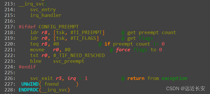 类似的,svc_entry应该是保存现场,irq_handler是处理中断,svc_exit应该是恢复现场和退出中断。