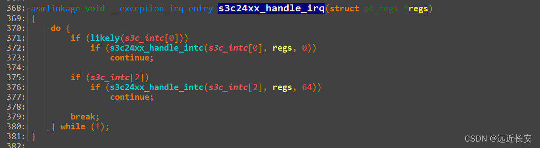 对应s3c2440芯片,则使用s3c24xx_handle_irq函数,作为自己的中断处理的入口函数。