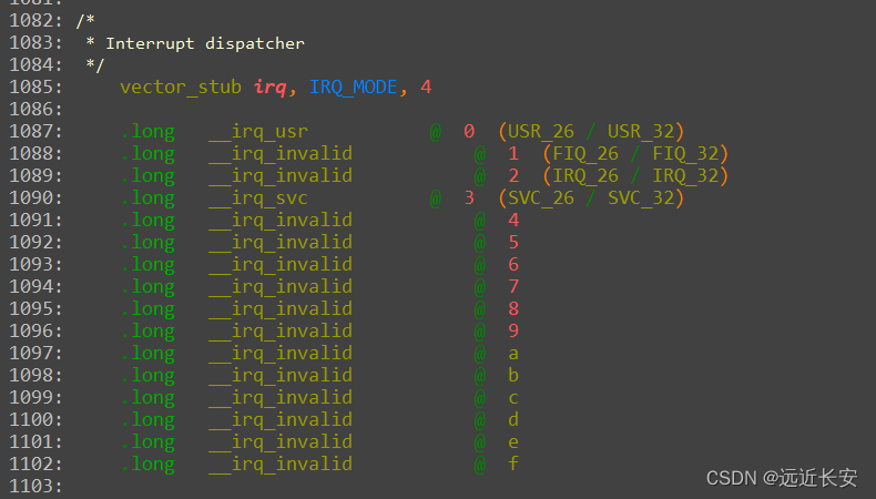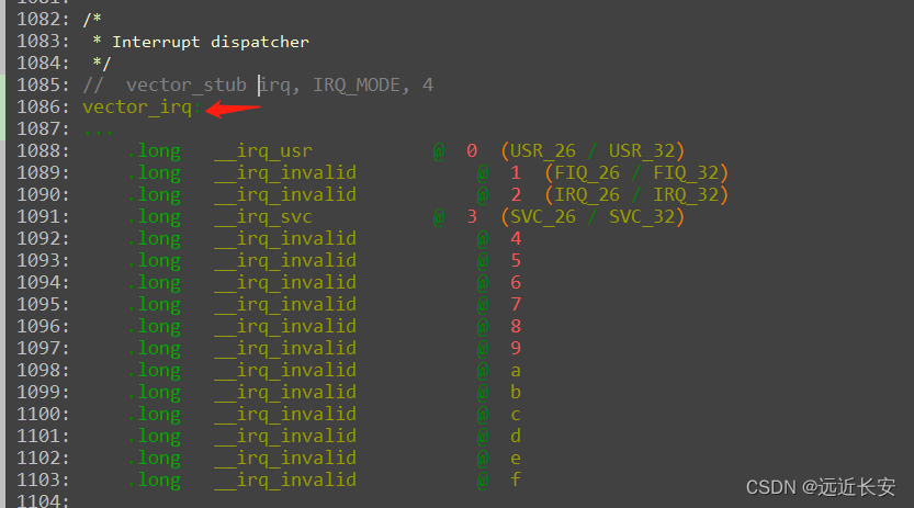 比如,当中断发生在用户态时,调用“.long __irq_usr”;当中断发生在管理模式下时,调用“.long __irq_svc”。