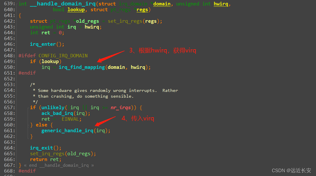在这个函数里面,CPU应该去读取中断寄存器,分辨发生的是哪个中断,获得硬件中断号——hwirq,然后通过hwirq可以在irq_desc数组中找到与之对应的那一项,这一项的下标叫做虚拟中断号——virq,hwirq和virq是不相同的,它们之间存在一定的偏移值。