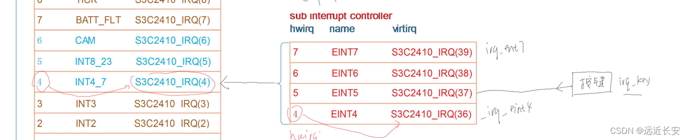 以s3c2440的4号中断为例,4号中断外接了4个引脚EINT4,5,6,7,这4个引脚产生了中断,都会触发4号中断。