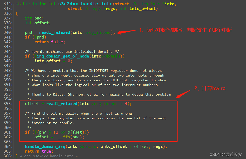 - 在分发函数中,首先会读取寄存器,进一步分析触发了哪个中断,得到对应的hwirq';