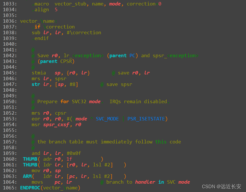 结合宏的定义,可以看出就是设置一个标号为vector_irq的段,省略号省略的是宏中描述的其他代码,这些代码暂不研究,它们应该会调用后面的相关函数。
