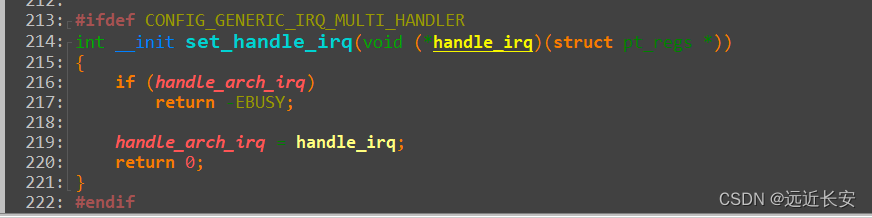 搜索handle_arch_irq,可以在 kernelirqhandle.c 文件中发现对应的设置函数set_handle_irq。