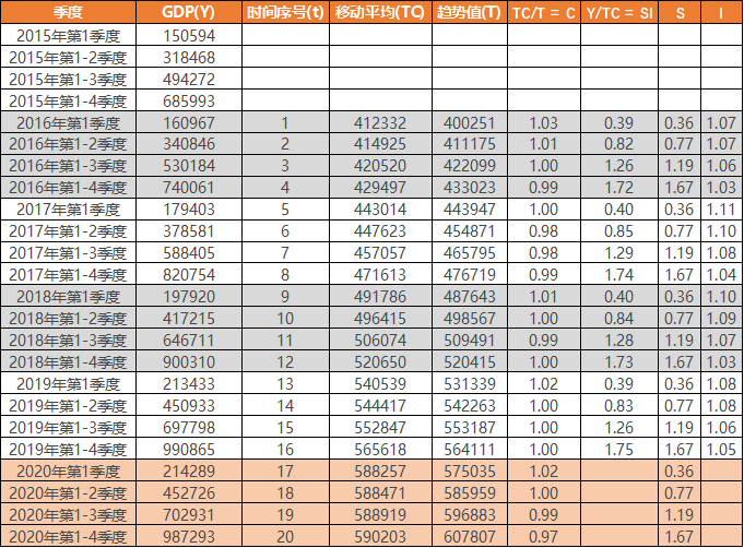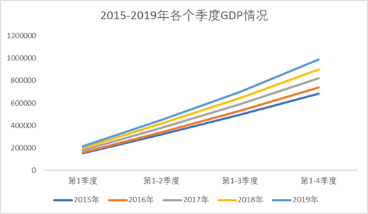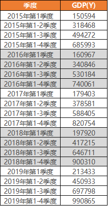 下表为2015年-2019年各个季度的GDP值,这是一个完整的时间序列,我们接下来就看下如何拆解这个时间序列中的各个因素。
