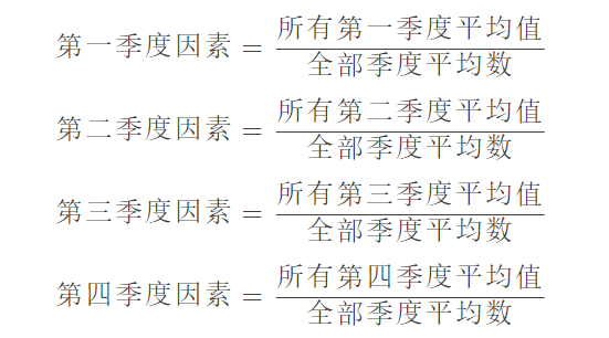 可以看到每年的第一季度到第四季度都是稳定上升,接下来求取下具体的季节因素大小,其实就是每个季节的在全年中的一个占比情况。