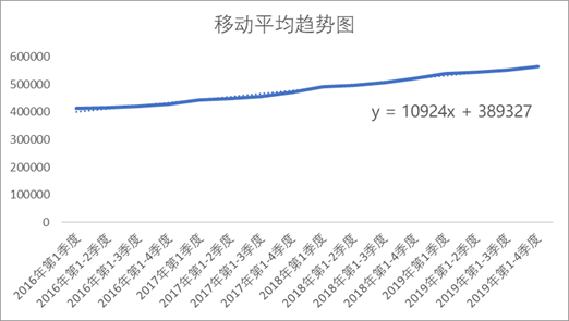 第二步根据求出来的移动平均值,拟合回归方程,因为看趋势像线性趋势,所以直接选择线性方程进行拟合,结果如下: