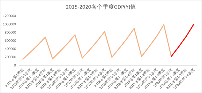 我们并对2020年各个季度的GDP做了一个预测,即下图中红线部分,每个季度的预测值等于该季度对应的TSC,因为每个值对应的I不相同,所以就没放进来,当然也可以对不同季度的I值取均值放进来。