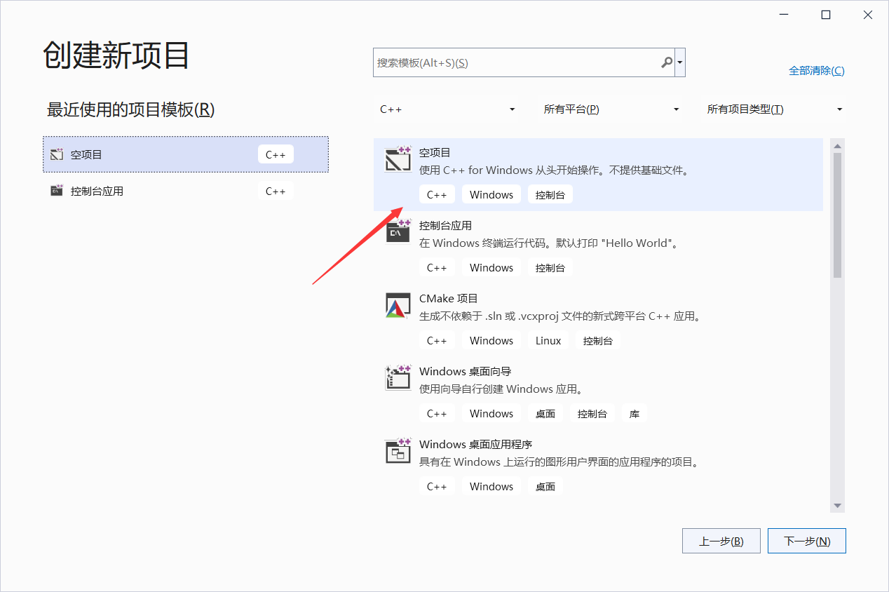 1.打开Visual Studio,创建一个新项目,选择空项目创建。