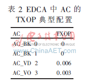 TXOP通过竞争产生或通过HCF授权,研究实验证明TXOP[AC]不应超过传送最大尺寸的数据帧的时间。由IEEE 802.11e EDCA为每个AC典型配置的TXOP[1]见表2,其中尽力而为业务和背景业务的TXOP为零,这表示它们除了传送RTS/CTS帧只能发送一个数据帧了。EDCA机制能够很好地支持高优先级业务传输。