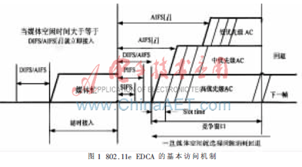 基于IEEE 802.11标准的无线局域网近年来得到了快速、广泛的应用,受到设备制造厂商的普遍支持。大多数网络均采用了IEEE 802.11 DCF 协议[1]。尽管DCF(Distributed Coordination Function)协议可以比较方便地组建网络,但由于各种新业务的相继出现,对网络性能有了更高的要求,不同业务在吞吐率、带宽、延时等方面有着不同的要求。为了在 MAC 层为网络业务传输提供一定程度的 QoS 服务支持,IEEE 802.11 工作组在 DCF 协议的基础上进一步推出EDCA(Enhanced Distributed Channel Access)协议。EDCA可以为不同类型的业务提供有优先级区分的信道接入传输服务,以使得网络中高优先级实时业务获得较低优先级普通业务优先的 MAC 层传输。
