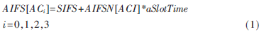 不同的AC采用不同的参数设置控制其信道接入传输过程,这些参数包括CWmin/CWmax、AIFS 以及TXOP。AIFS由DIFS 扩展而来,其大小由式(1)确定: