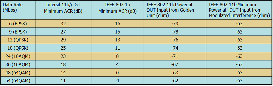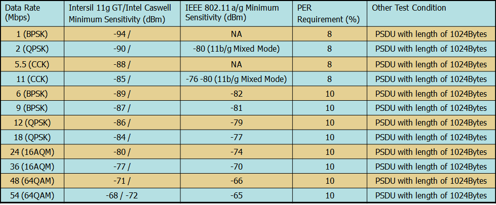 For 802.11g, 10% PER Maximum of DUT, where Input Power (shown in the following table) from Golden Unit at ideal frequency and the Power from Modulated Adjacent Channel Interface (shown in the following table) at 25MHz away from the ideal frequency with PSDU length 1000Bytes