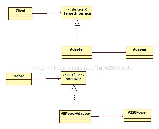 上面是适配器的类图,下面是我们的例子的类图,咋样,还不错吧。没事画个图也不错,不然软件都白装了。。。。