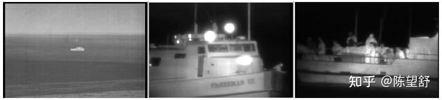 ATV2000i 定型产品 ARG TV 的实验表明其在高级防卫应用中的有效性。图 1 给出 ATV-2000i 观察 1.9km 处的渔船,该渔船首先由非制冷焦平面热成像系统发现(如图 1(a)),继而由距离选通相机获取目标场景图像,由图 3(b),(c)可获得驾驶室、船舷上的名称和甲板上人员数目等目标状态和位置信息。图 2 和图 3分别给出激光选通成像与被动微光成像、雪天主动连续照明与距离选通成像的图像比较,可以看出:激光距离选通成像在观察透车/室窗成像以及恶劣天候下的成像具有比较明显的优势。