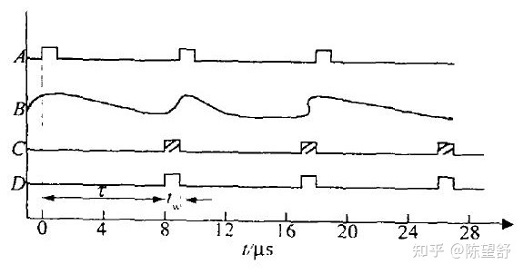 由于激光脉冲在1220m上来回渡越时间是8mm,所以选通脉冲应在照明脉冲前沿后延迟8mm。图中,波形A为激光脉冲照明输出;波形B为接收器接收到的脉冲激光投向目标的过程中产生的后向散射;波形C为激光脉冲由目标返回到接收器上的反射辐射;波形D为接收器的选通脉冲;t为延迟脉冲发生器的延迟时间;tw为接收器的选通脉冲宽度;l为激光器到目标的距离。以上所提到的是假定激光器、延迟脉冲发生器和像增强器驱动电路为零传输时间延迟的理想选通情况,但是在实际的应用中,必须考虑以上传输时间延迟。采用图11所示的同步控制方案必须考虑激光器、延迟脉冲发生器和像增强器驱动电路的传输时间延迟。通常延迟脉冲发生器和像增强器驱动电路的传输时间延迟容易精确测量得到,但是激光器的传输时间延迟一般为几十毫秒,不容易精确测量,而且受到激光器内部的工作物质、工作温度等多种因素的影响。为了克服激光器的传输时间延迟,提出了一种新的距离选通同步控制方案,图3中给出了采用该方案设计的距离选通成像系统。