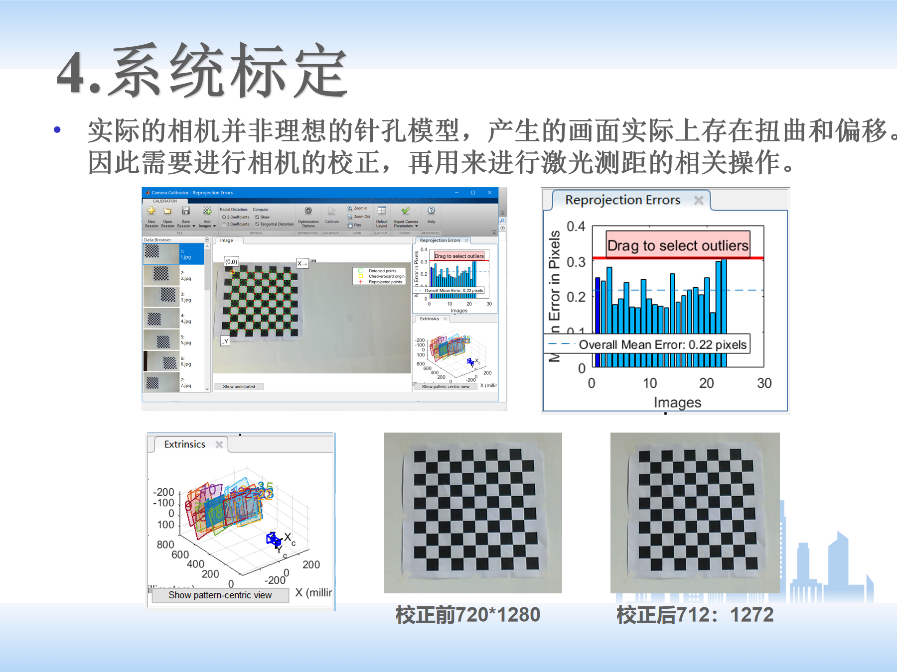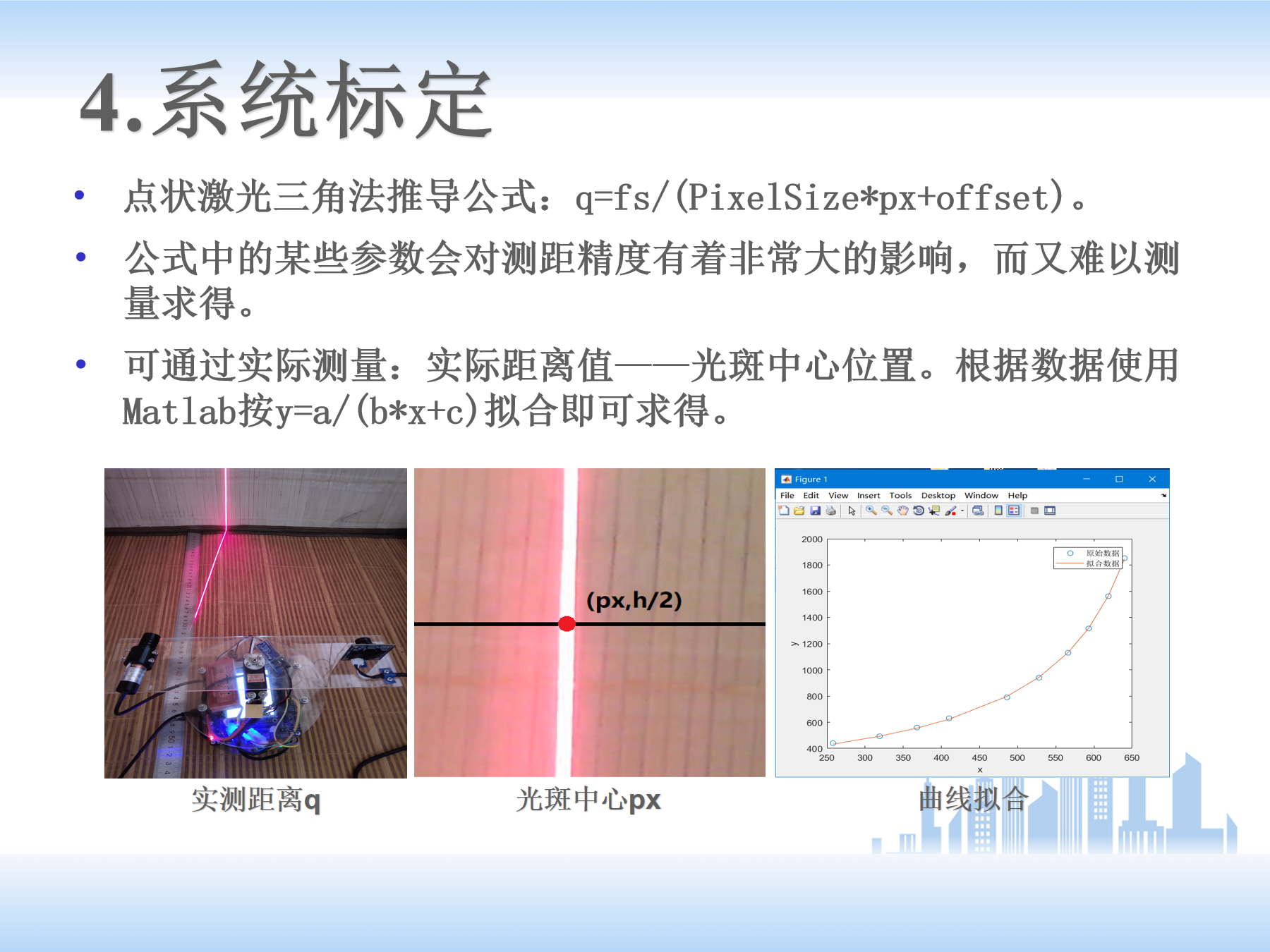 (4)下面是标定部分。激光中心坐标能够实现提取后,需要后续进行转换,以实现二维图像坐标到三维点云数据的转换,但转换前需要对整个系统进行标定校正。相机需要标定,因为相机有畸变;平台需要标定,因为由三角测距法的公式(求取被测物上任意点到扫描平台基线中心的距离),一方面来说,这些参数值有些能测出来但未必准确;另一方面,有些参数值用正常手段没办法测量。这里用了拟合的方法,通过几组实际测量的对应参数,来确定自己平台的参数。