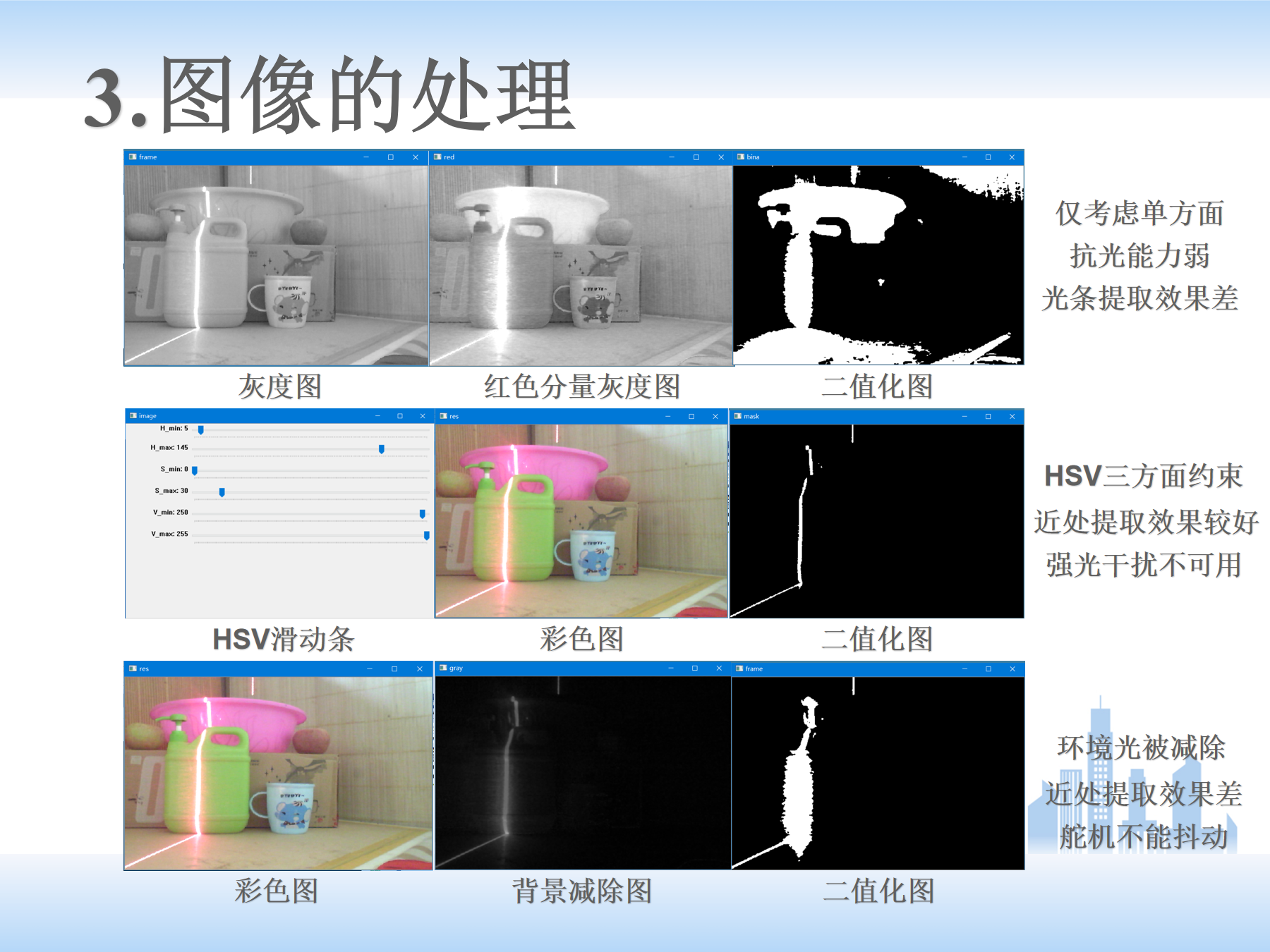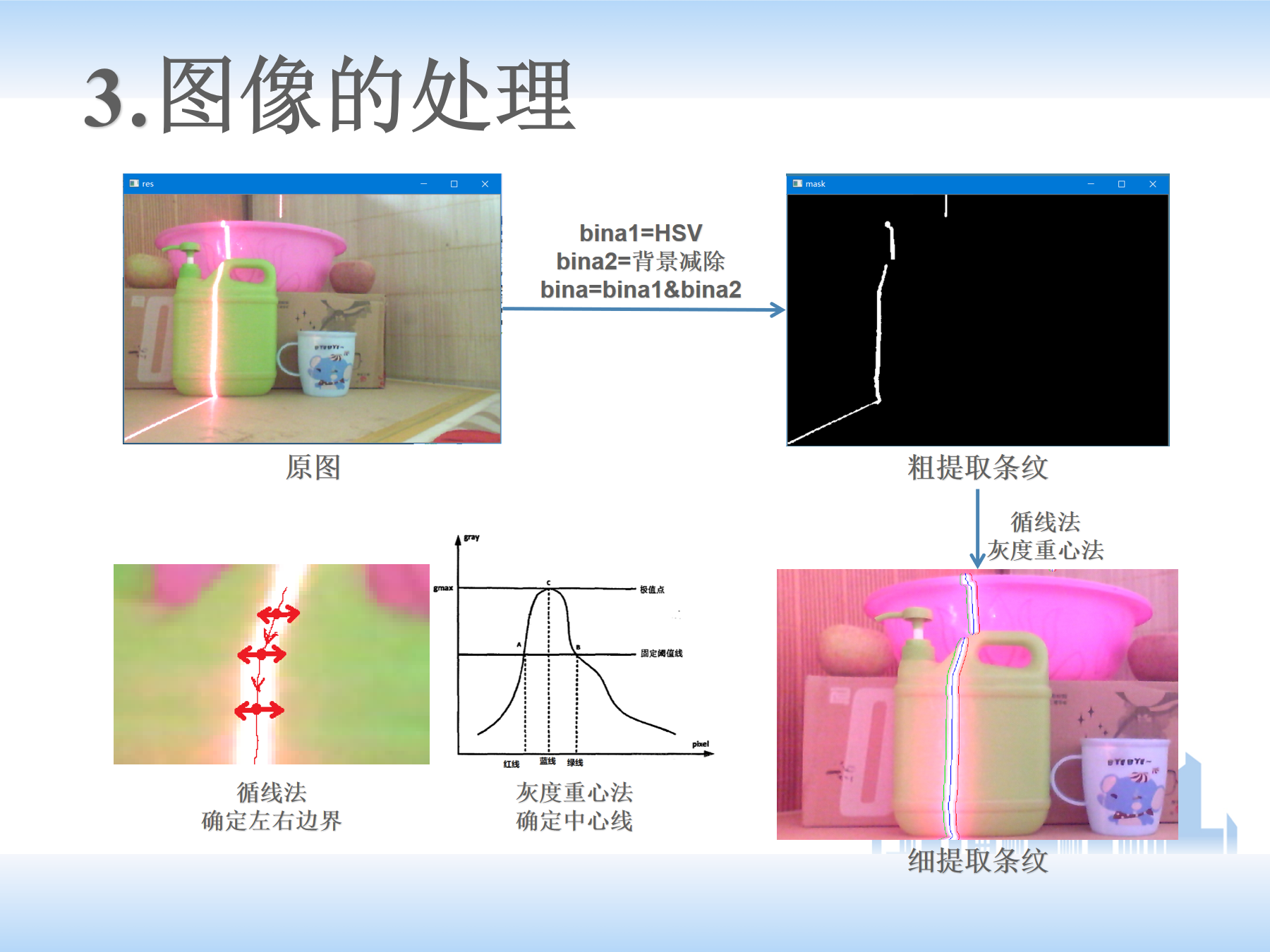 (3)下面是最重要的激光条的提取。二值化和灰度提取肯定不行,图像简直没法看;后来用的HSV方法过滤阳光,用Python写了个滑动条的小程序,效果还凑活,但距离远了或者遇到强光就不太行;后来试了下两幅图像相减(有激光条的图像减去没有激光条的背景图像),发现距离近了效果变差。最后,将两种方法结合了一下,先用HSV过滤的方法得到bina1,再用背景减除的方法得到bina2,这两幅结果图再进行“与”操作,得到的激光条比较干净。再通过左右循线找边界以及对原彩色/灰度图使用用灰度重心法得到单像素的激光条纹。