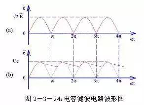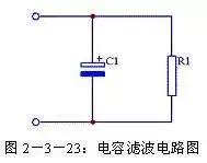 电容滤波电路图见图2-3-23,电容滤波电路是利用电容的充放电原理达到滤波的作用。在脉动直流波形的上升段,电容C1充电,由于充电时间常数很小,所以充电速度很快;